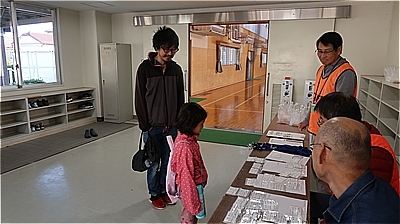 受付で名札と 'からくり' の工作材を受け取って会場へ