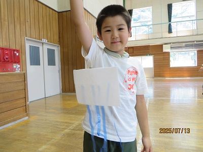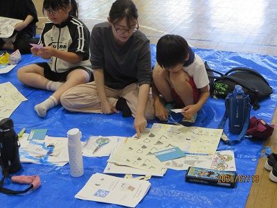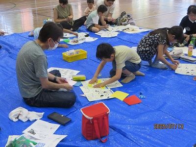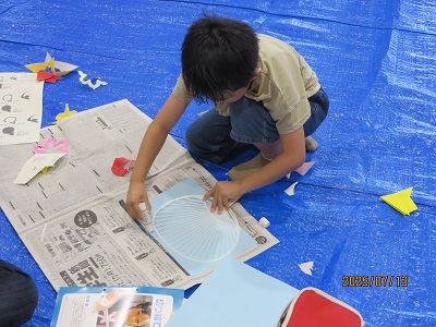 開校式では、班ごとに丸くなり自己紹介をしました。みんなが元気に名前を言いあいさつできました。周りも拍手で応えてくれました。スチロールたこは、例年のように、みんな楽しそうに走り回りました。たこのしっぽの本数や長さ、太さがいろいろありました。紋切りうちわは、型紙を切って広げるとどんな模様になるかを親子で熱心に確かめていました。家で、オリジナルの型紙を作ってほしいです。