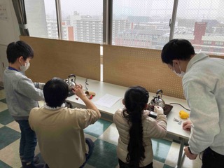 実際にモールス信号の交信を聞いてから、本機の製作に取り掛かりました。小型のブレッドボードに6個の部品を挿していきます。とても小さい部品や向きが決まっている部品がありましたが、親子で協力して組み立てることができました。できあがったら、講師が打ったモールス信号を当てたり、何人かの子供に打ってもらってみんなで当てたりしました。