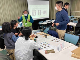 講師からスーパー竹とんぼの作り方をパワーポイントで教えていただきながら羽を削ったり、バランスをとったりしました。羽をやかんの蒸気で曲げて接着剤で軸につけて完成です。会場が9階なので室内で飛ばしました。初めて飛ばす子はなかなか上手に回せず、指導者に教えてもらい何回か繰り返すことで、上手に飛ばすことができるようになりました。