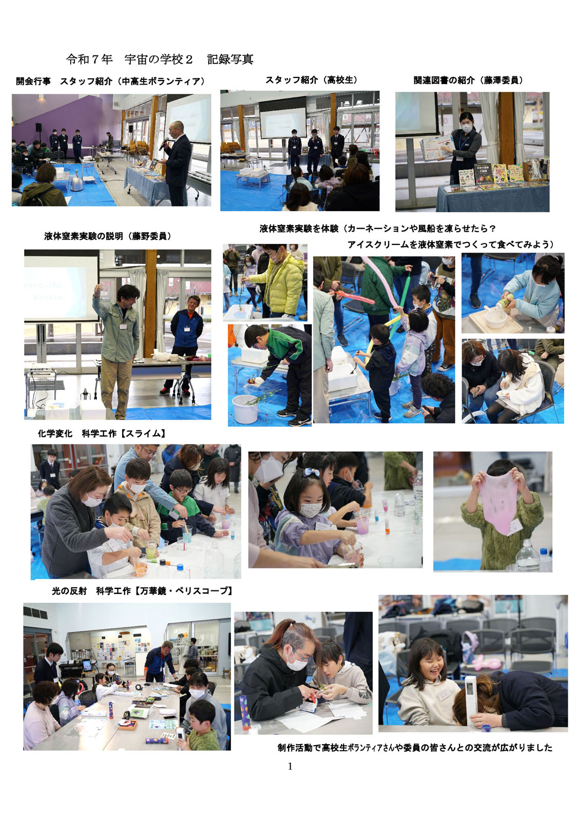 | プログラム | ①科学実験「液体窒素実験」 ②科学工作・スライムづくり・万華鏡、ペリスコープ |
