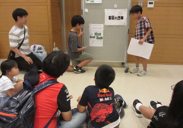 第5回スクーリングは4つのグループに分かれて、子どもたちが自宅で保護者と一緒に研究したレポートを展示ボードに貼って発表をしました。