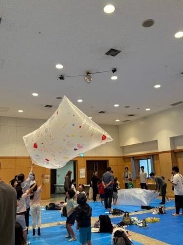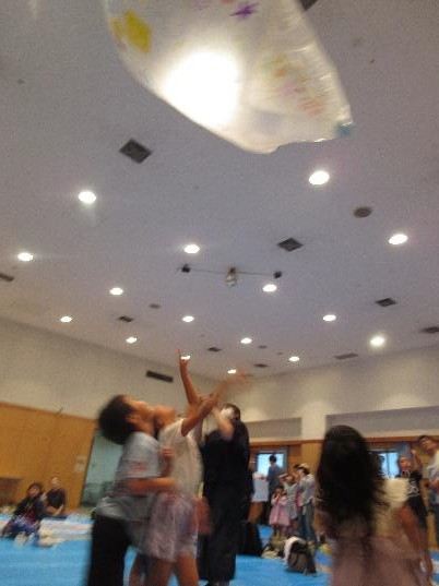 完成した熱気球に、ドライヤーで熱風を送り、膨らんだ熱気球がホールの上へ舞い上がりました。