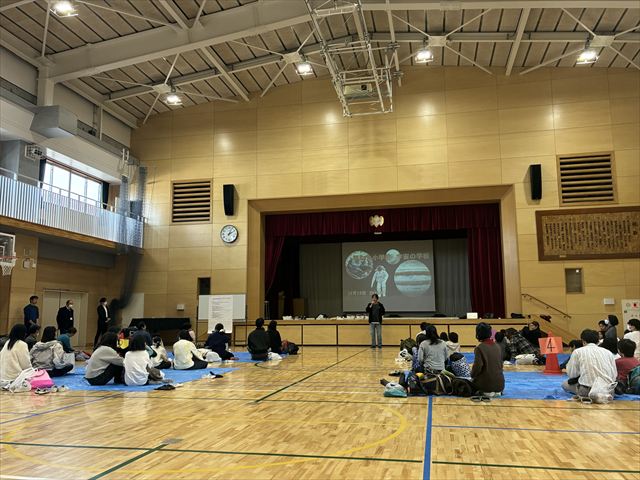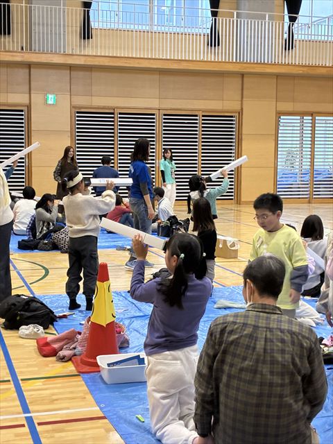 本日のスクーリングでは、柴田先生に加え、千代田区立九段中等教育学校の中村茂先生にもご来校いただき、望遠鏡の作り方に関するご指導およびご講演を賜りました。CCDカメラやインカムを活用し、大画面に映し出しながらリアルタイムで分かりやすく解説してくださり、参加者は熱心に作成に取り組んでいました。作業は難しく、親子で工夫を重ねたり、班員に協力を得たりしながら、試行錯誤を繰り返しつつ進めました。望遠鏡が完成すると「見えた」と歓声が上がり、体育館の端で校長先生やスタッフが手を振る姿や、校庭側の窓からの景色を楽しむ様子が見られました。ピントが合わずうまく見えないなどの不具合が生じた場合には、レンズの貼り方を再確認し改良を重ねることで、再挑戦して見えるようになった姿も見受けられました。特に、保護者が積極的に作成に参加し、親子で協力して取り組む姿は非常に印象的でした。また、校長先生、副校長先生も何度も会場に足を運んでくださり、先生方にとっても魅力的な活動であったことがうかがえました。