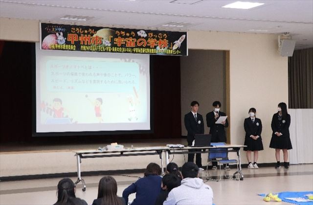 学生ボランティア日川高校生SSHコースの生徒4名が「運動時におけるスポーツオノマトペに果たす役割」をテーマに研究の成果を発表しました。「スポーツオノマトペ」の説明(声を出す時と出さない時のボールの飛距離が異なること)と、実際に参加者にボールを投げていただき、その効果を体験してもらいました。ボールを投げた時に声を出すとボールの飛距離が伸びた結果となりました。