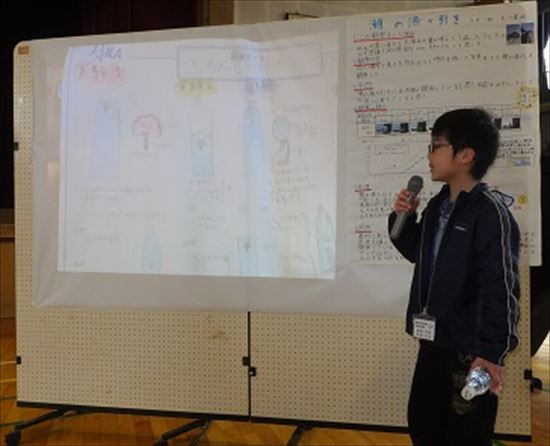 次は5年生で 潮の満ち引きのテーマで発表してくれました。他に3件のレポート提出がありました