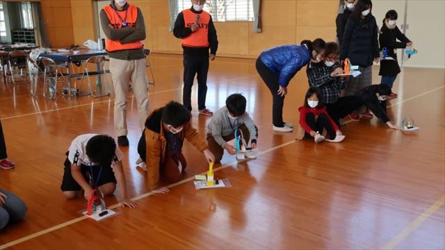 班ごとのレースの予選の勝者による決勝レースです。誰のホバークラフトがまっすぐ、速く走るかな