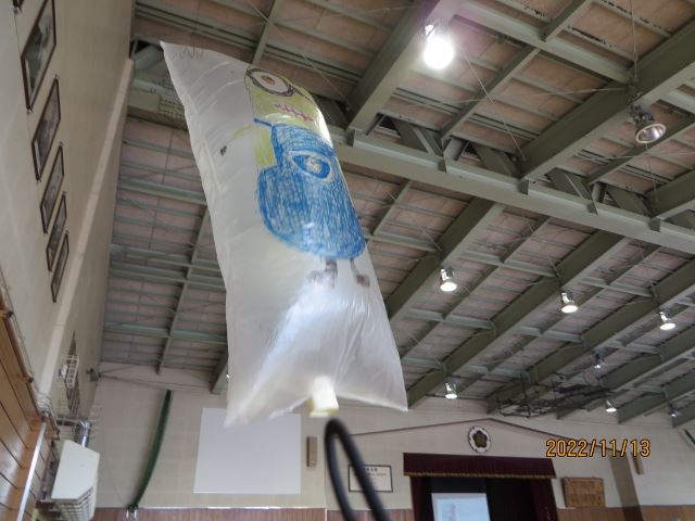 小型熱気球を家族で制作するのは初めてですが、親子が仲良く力を合わせていました。上がり方は、大型よりもゆっくりですが天井に届きました。送風口から熱風があふれ出るまで入れるのが肝心。レポート発表は、9名がプロジェクターに投影して全体に発表しました。聞く側は真剣に耳を傾け、質問もしてくれました。開催するまでは迷いましたが、3年ぶりに実施できてよかった。