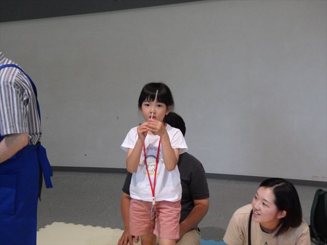 物を飛ばすには押し出す力が必要!ストローを使って綿棒を飛ばしてみよう!みんなストローを勢いよく吹いて、綿棒を3階ほどの高さまで飛ばしました。