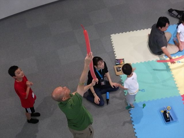 風船はロケットと同じ⁉反動の力で飛びます。細長い風船を膨らませて離すと、なんと5m以上の高さまで飛んで大喜び!