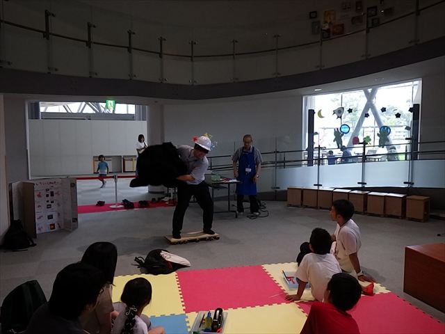 反動を詳しく!質量が大きいものを飛ばすほど反動も大きく‼実際に空気(ブロワー)と重たい暗幕で比較。暗幕を投げると反動で講師が動きびっくり!
