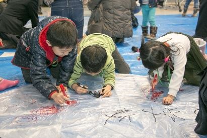 次は熱気球の仕組みと作り方の説明を聞き、制作です。親子で協力して本体を