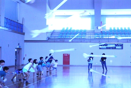 ロケットを作り上げいざ、広い体育館で飛ばす時子ども達はワクワクと不安が