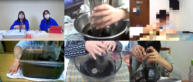 今回は参加者それぞれがパソコンの前で実験を行い、全体で結果を確認しながら進めていった。携帯用カイロの中身をペットボトルやガラスのびんに出し、振ったり水に入れたりして様子を確かめることで、カイロが空気中の気体を使って暖かくなることを確かめた。実験ではパソコンの前に水が入った容器を持ってくる必要があるため、こぼさないよう十分に注意した。参加者が実験結果に驚き、興味深くカイロを観察する姿が印象的であった。