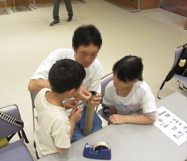第3回スクーリングは、「天体望遠鏡を作ろう」を実施しました。度数1.5の老眼鏡レンズを対物レンズにしました。接眼レンズは虫メガネレンズを2枚組み合わせました。天体望遠鏡を載せる木製架台も作りました。作業が難しいところは、すべてスタッフが事前に作り上げていたので、親子で協力しながら、参加者全員が上手に組み立てることができました。「こんな身近な材料で天体望遠鏡ができるんだ」と驚いていました。さらに外へ出て天体望遠鏡で遠くの景色を見ると「すごい!良く見える!」と大喜びでした。
