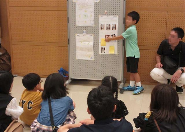 第5回スクーリングは4つのグループに分かれて、子どもたちが自宅で保護者と一緒に研究したレポートを展示ボードに貼って発表をしました。