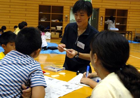 ボランティアスタッフがそれぞれ10人前後の子どもに作り方の説明をします。