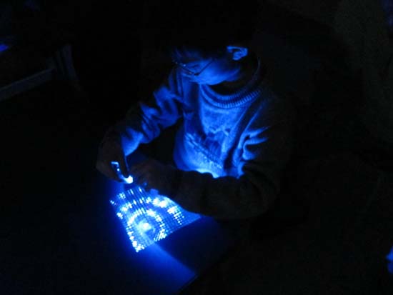 子どもたちはプリズムシートを使って、白色の光にはいろいろな色が入っている事を確認しました。
