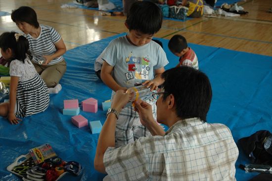 水ロケット作り ペットボトルを切断します。曲がらないよう切るためにビニールテープを貼ったり。 マジックで線を引いたりと様々です。 曲がっていないか床を転がして点検。 ランチャーの使い方と諸注意。 発射。 片付け。 次回は、11月24日(土)です。
