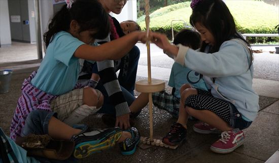 その後はA班とB班に分かれて「火おこし体験」を行いました。現代では宇宙環境まで利用しているけど、昔の人々はどんなエネルギーを生活に利用していたのかな?東京都埋蔵文化財センターの職員の方の指示に従って2家族で1台の「舞ぎり式火おこし器」を使い、協力しながら火をおこします。これがなかなか簡単には火種ができませんがなんとか全員が火をおこすことが出来ました。火種から炎まで大きくします。成功した組からは拍手が自然と起きていました。みんなの運動エネルギーが摩擦力に変わりました!