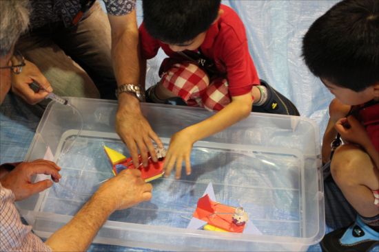 相談しながらスチロールカッターでボードを切って自由に飾り付け。