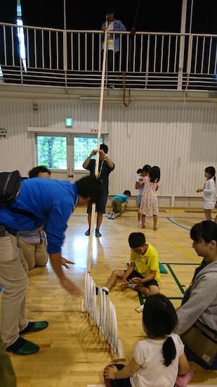 そのほか、ひねり技や、山越え型などに取り組んだチームもある中、助っ人の中学生ボランティア中心に体育館2階からの長大バージョンも試して見ました。これは最初の坂の安定が難しく時間内に大成功には至りませんでしたが、それぞれが成功させるために工夫をしてくれ、班内の協力関係も促進されとても良いスタートになりました。