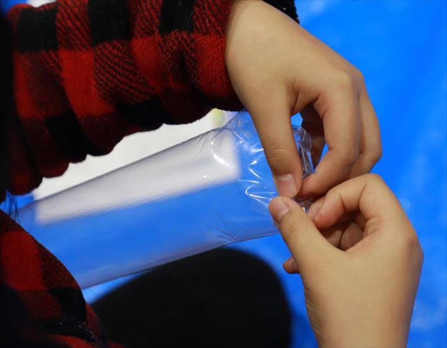 紙をかさ袋に巻き付けてセロテープで止めます。
