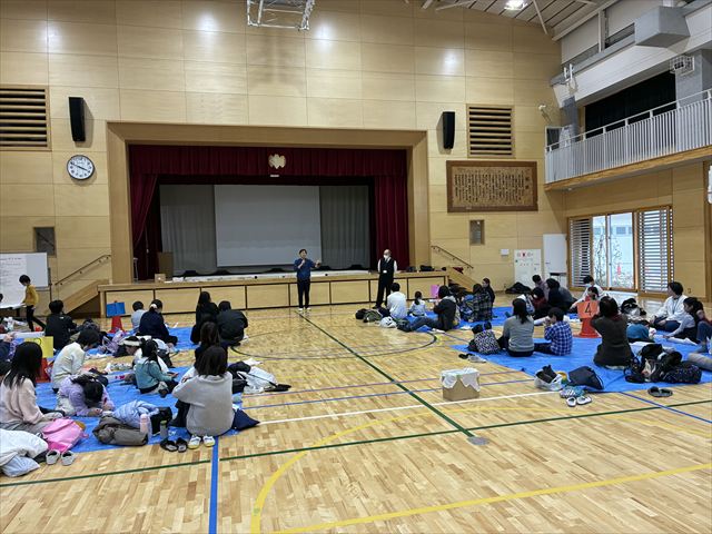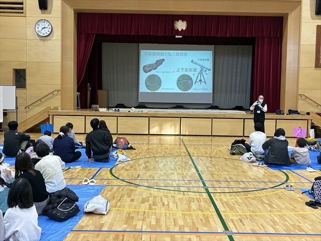 本日のスクーリングでは、柴田先生に加え、千代田区立九段中等教育学校の中村茂先生にもご来校いただき、望遠鏡の作り方に関するご指導およびご講演を賜りました。CCDカメラやインカムを活用し、大画面に映し出しながらリアルタイムで分かりやすく解説してくださり、参加者は熱心に作成に取り組んでいました。作業は難しく、親子で工夫を重ねたり、班員に協力を得たりしながら、試行錯誤を繰り返しつつ進めました。望遠鏡が完成すると「見えた」と歓声が上がり、体育館の端で校長先生やスタッフが手を振る姿や、校庭側の窓からの景色を楽しむ様子が見られました。ピントが合わずうまく見えないなどの不具合が生じた場合には、レンズの貼り方を再確認し改良を重ねることで、再挑戦して見えるようになった姿も見受けられました。特に、保護者が積極的に作成に参加し、親子で協力して取り組む姿は非常に印象的でした。また、校長先生、副校長先生も何度も会場に足を運んでくださり、先生方にとっても魅力的な活動であったことがうかがえました。